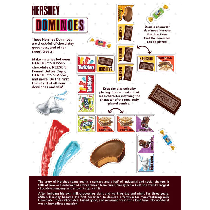 Indulge in scrumptious family fun with MasterPieces Hershey's 28 Piece Picture Dominoes! Featuring delectable Hershey's Kisses, Reese's Peanut Butter Cups, Hershey's S'mores, and more, these dominoes offer a mouthwatering twist to the classic game. Gather 2-4 players aged 3+ and compete to be the first to match and devour all your dominoes. With a perfect balance of chocolaty goodness and sweet treats, this delightful game guarantees quality bonding time and satisfying victories.
