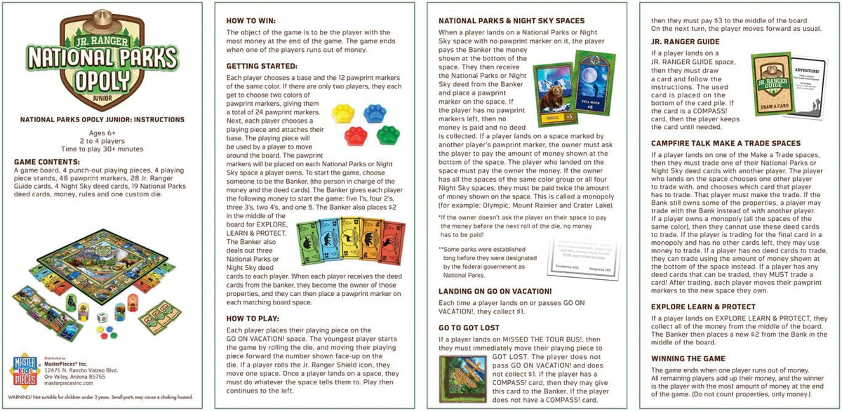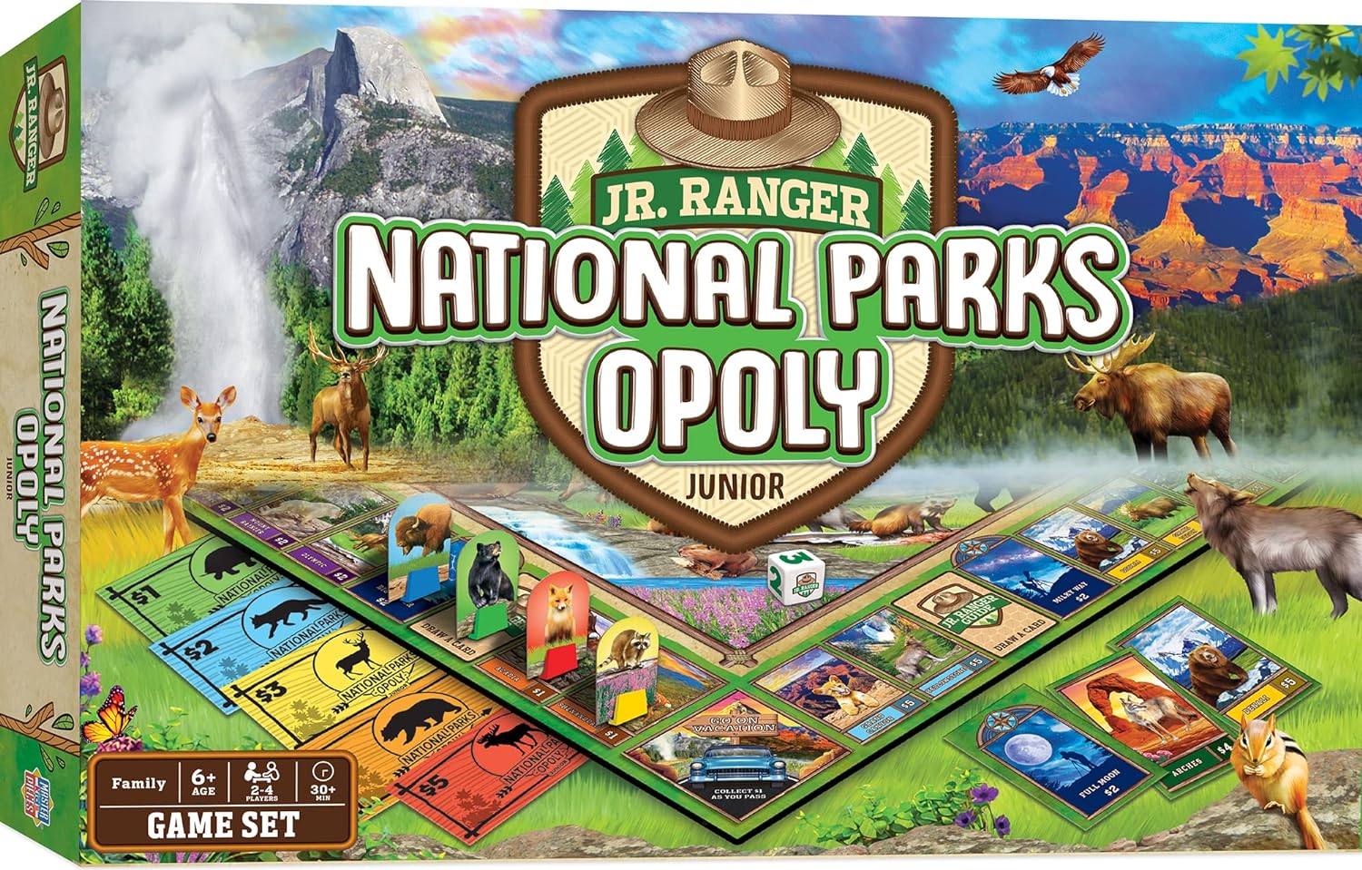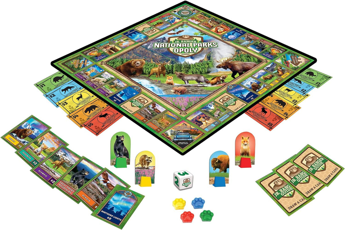 Take a Junior Ranger adventure all over the USA with this officially licensed National Parks Opoly Jr. This board game is perfect for families, kids, and adults! Travel to famous National Parks and learn about their most iconic animals. As you collect National Parks, learn unique facts about each one on the back of the card. Just make sure you don't miss the bus or get lost along the way. Discover awe-inspiring landscapes and amazing animals with National Parks Opoly Jr. Includes: Game Board, 4 Punch-Out Playing Pieces with Plastic Stands, 48 Paw Print Plastic Markers, 28 Jr. Ranger Guide Cards, 20 National Park Deed Cards, 4 Night Sky Cards, Custom Money, Custom Jr. Ranger Die, and Rules