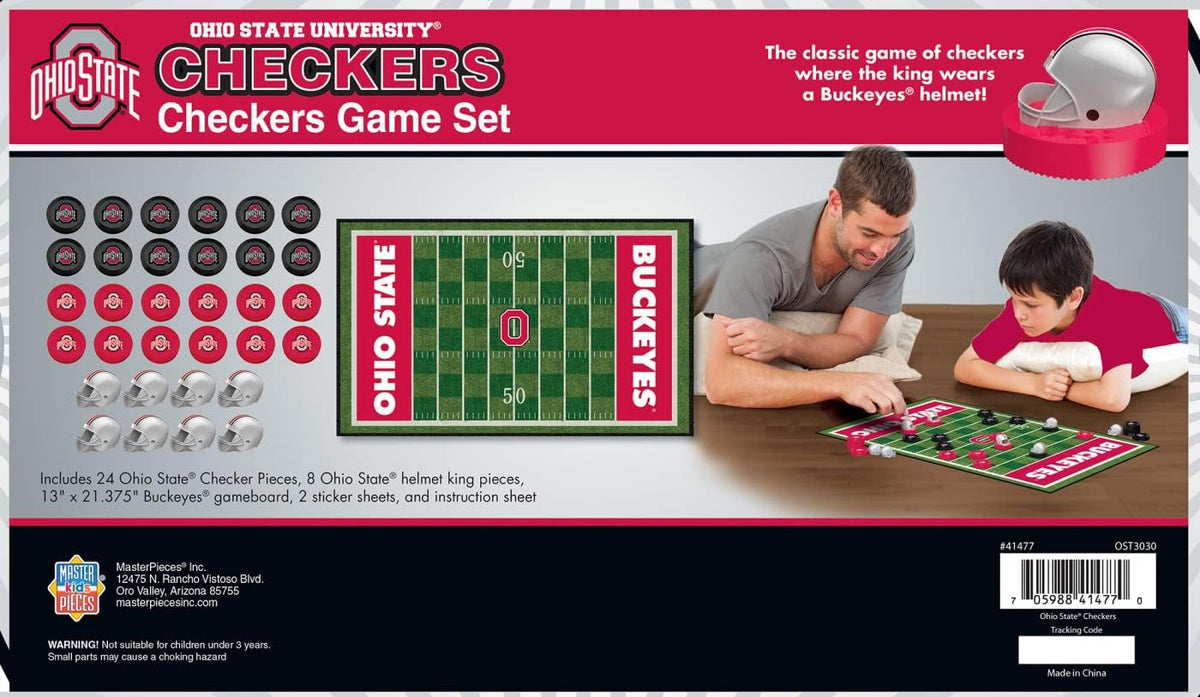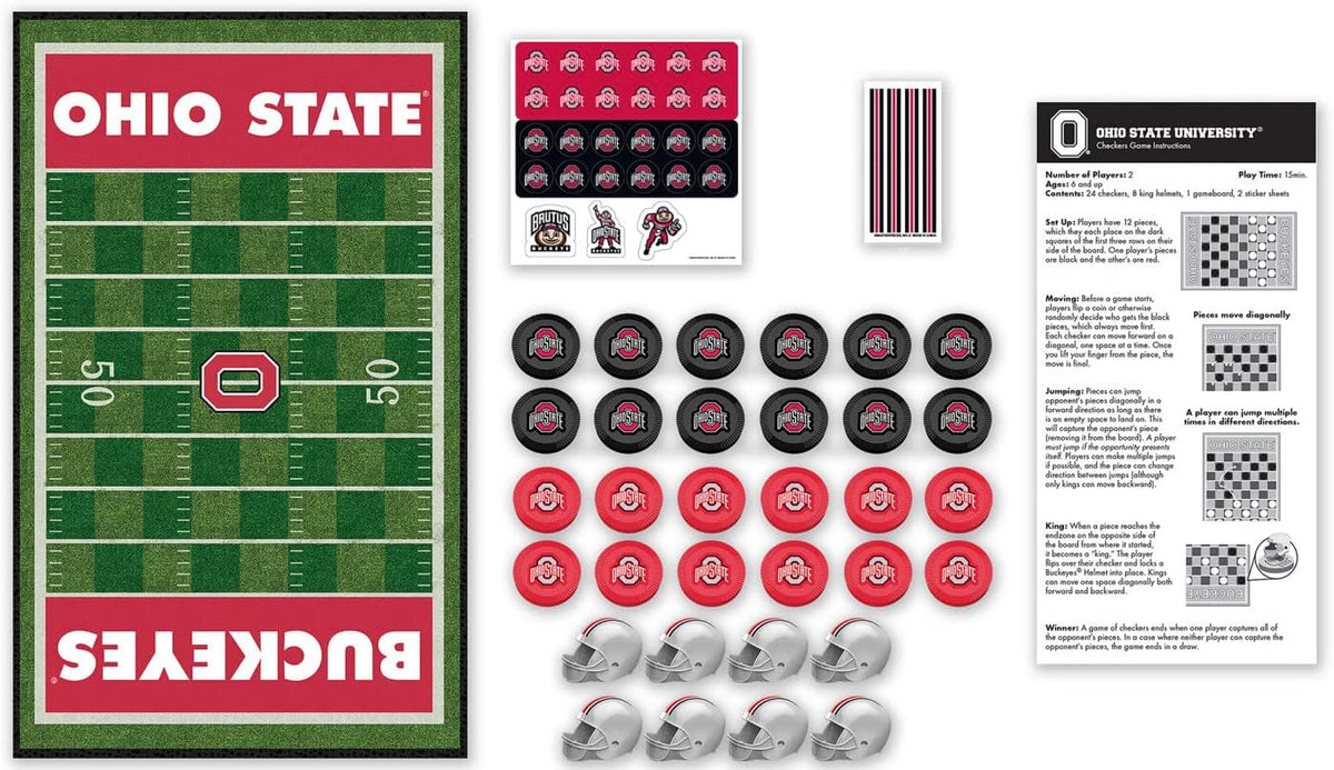 This MasterPieces Collegiate Ohio State Checkers Game is the classic game of checkers where the king wears an Ohio State football helmet! The Ohio State checkers game includes 24 Ohio State checkers pieces, 8 Ohio State football helmet king pieces, a 13" x 21.375" Ohio State game board, 1 sticker sheet, and an instruction sheet.
