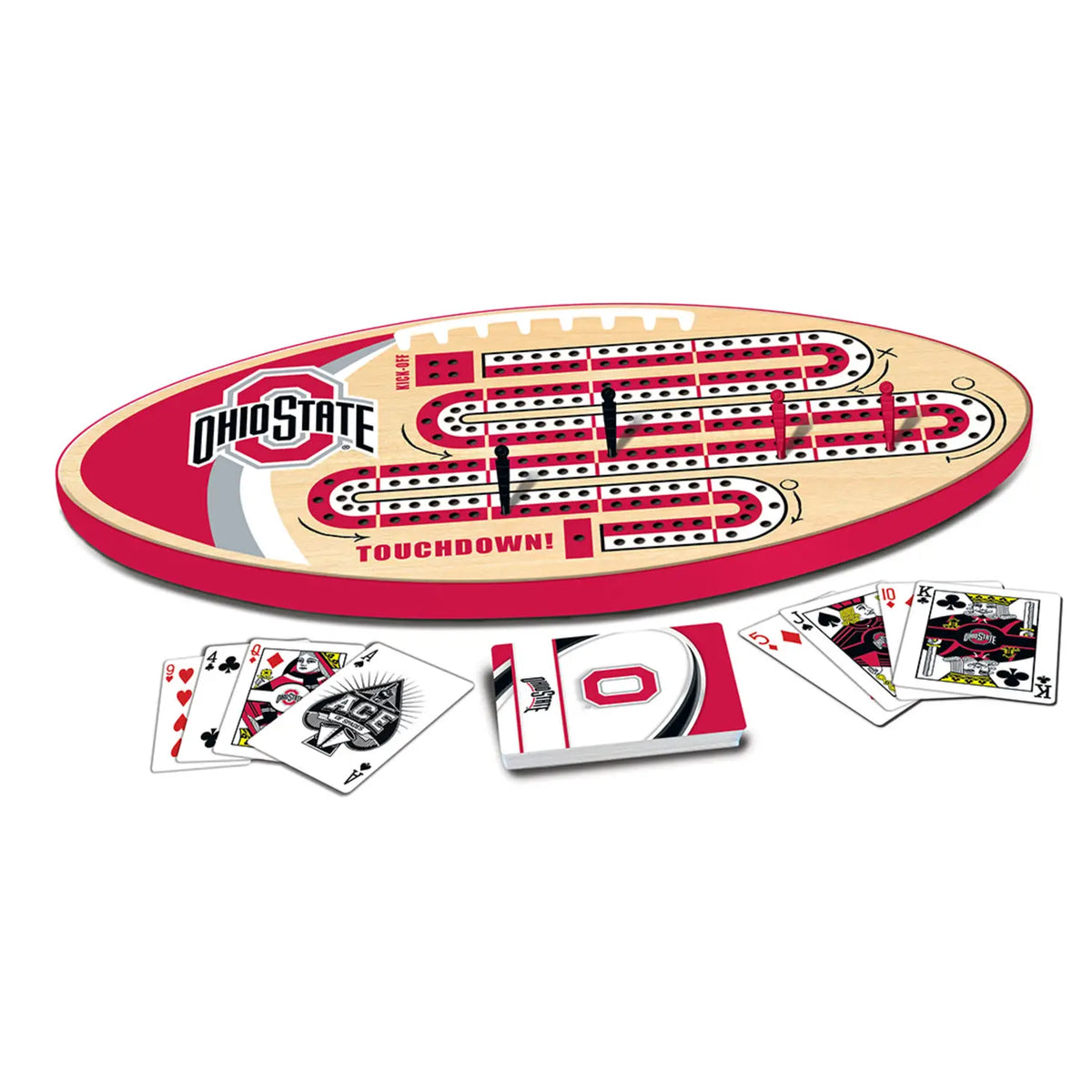 Looking for something fun and challenging to do while cheering on your Ohio State Buckeyes? Look no further than this MasterPieces officially licensed NCAA Ohio State Buckeyes Cribbage Game Set for adults and families! This set includes a durable wood-finished cribbage game board, shaped like a football, with authentic Ohio State Buckeyes logos. Peg your way around the board with Yardage Marker Pegs, and make runs with hand-drawn Kings, Queens, and Jacks dressed in team gear. This Cribbage Game Set is perfect for the ultimate fan of the Ohio State Buckeyes and Cribbage.