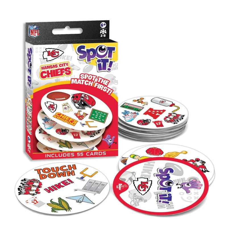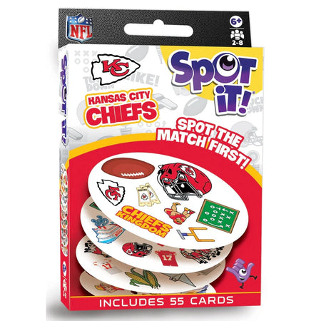 Spot It! Kansas City Chiefs Edition puts a football spin on the family favorite. Just like the other Spot It! games, this NFL Kansas City Chiefs Edition comes with a variety of unique symbols for you to identify and match from card to card. Many of the symbols represent Kansas City Chiefs and the game of football. Play it once or play all night, with 55 unique cards and five different mini-games, you’ll catch yourself going into extra innings with Spot It! NFL Kansas City Chiefs Edition.