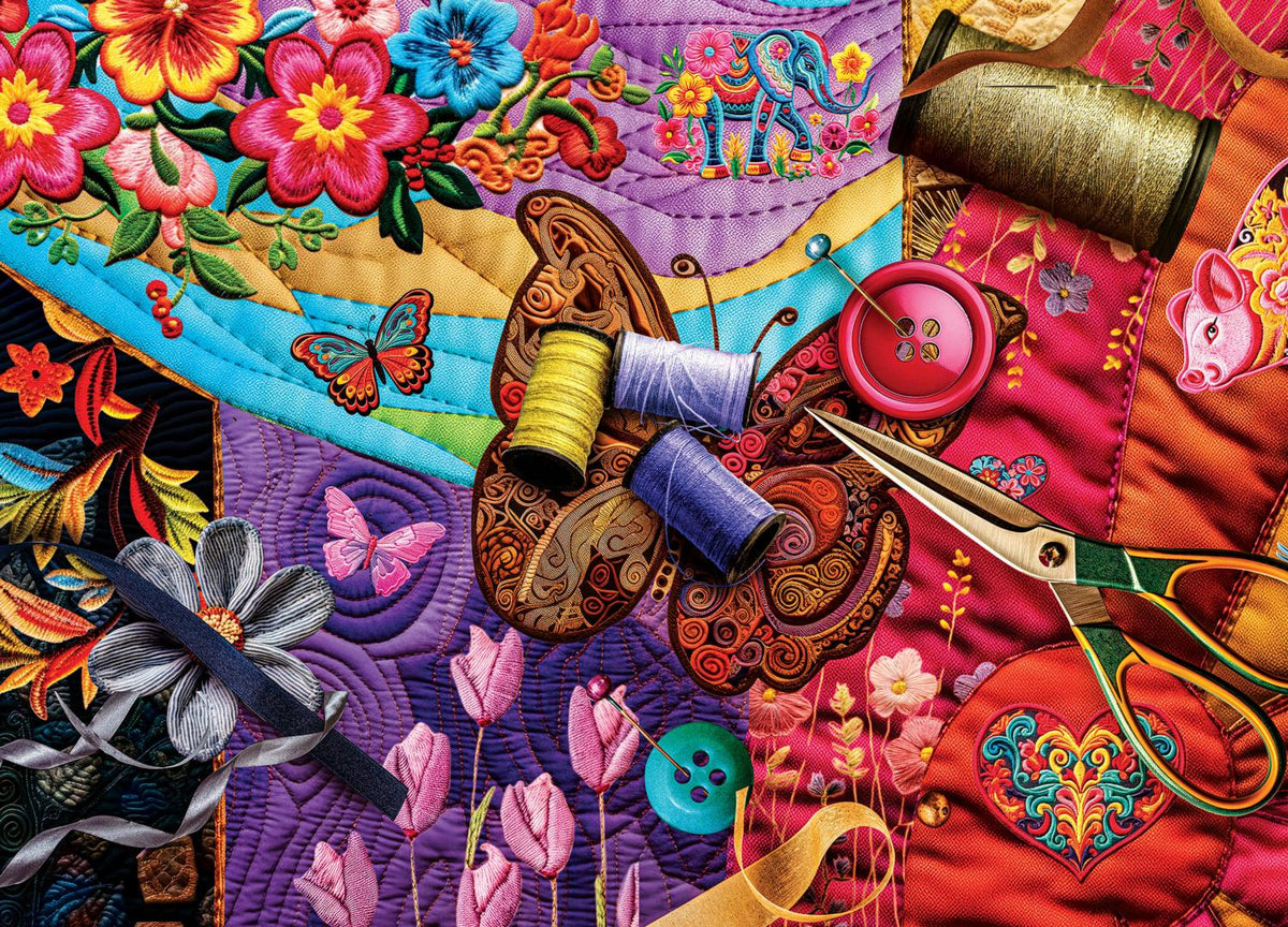 Picture yourself at the center of a crafting haven, where a quilter's table overflows with an assortment of tools and a kaleidoscope of vibrant threads. But the real magic unfolds in the background: a stunning quilt adorned with a flurry of blooming flowers and graceful butterflies, each stitch a testament to the joy of crafting. As you assemble each piece, you'll feel the thrill of discovery and the satisfaction of bringing this lively tableau to life. Lose yourself in the rhythm of creativity and embrace the playful spirit that infuses every corner of this puzzle. Whether you're a seasoned quilter or a crafting enthusiast, this puzzle promises hours of entertainment and pure, unadulterated fun. So, gather your friends, unleash your imagination, and let the joy of crafting take flight.