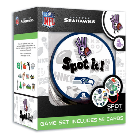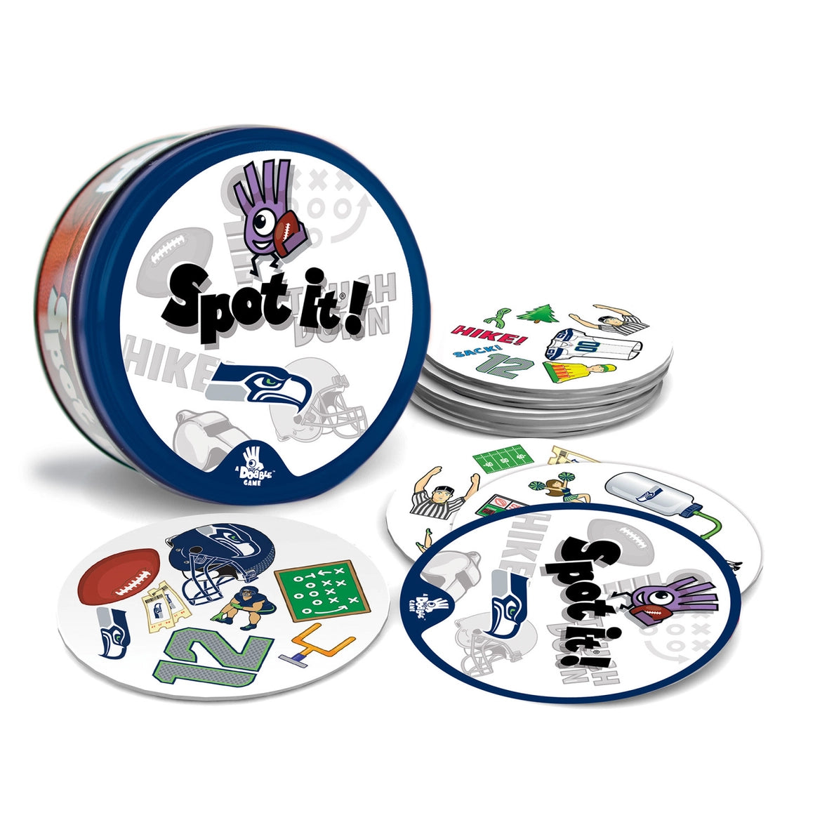 Spot It! Officially licensed NFL Seattle Seahawks Edition puts an exciting spin on the family favorite. Just like the other Spot It! games, this Seattle Seahawks Edition comes with a variety of unique symbols for you to identify and match from card to card. Many of the symbols represent the Seattle Seahawks and the league. Play it once or play all night, with 55 unique cards and five different mini-games, you'll catch yourself going into extra innings with Spot It! Seattle Seahawks Edition. Games take approximately 5 to 10 min to complete and is perfect for children and adults ages 7 and up.