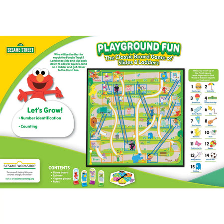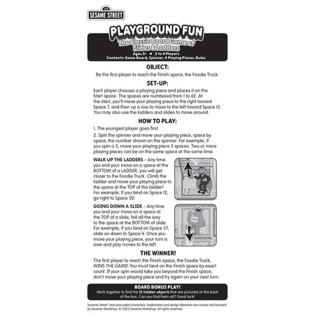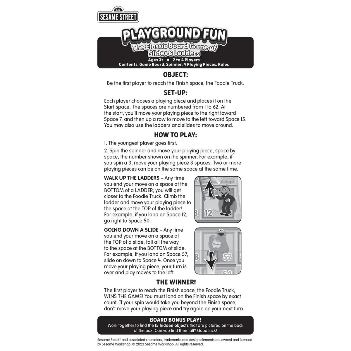 Introducing the fun and educational Sesame Street Playground Fun Board Game! This classic game of "Slides and Ladders" is a great way to spend quality time with your family and friends while introducing important lessons about emotions. Players as young as 3 years old will love the brightly colored game board, 4 playing pieces with bases, spinner, and rules. As players go up and down using the slides and ladders, they will get to meet their favorite characters on the show who deal with big feelings such as disappointment, frustration, anger, and sadness. Parents can use this game as an opportunity to start meaningful conversations about how to handle these feelings in positive ways.
