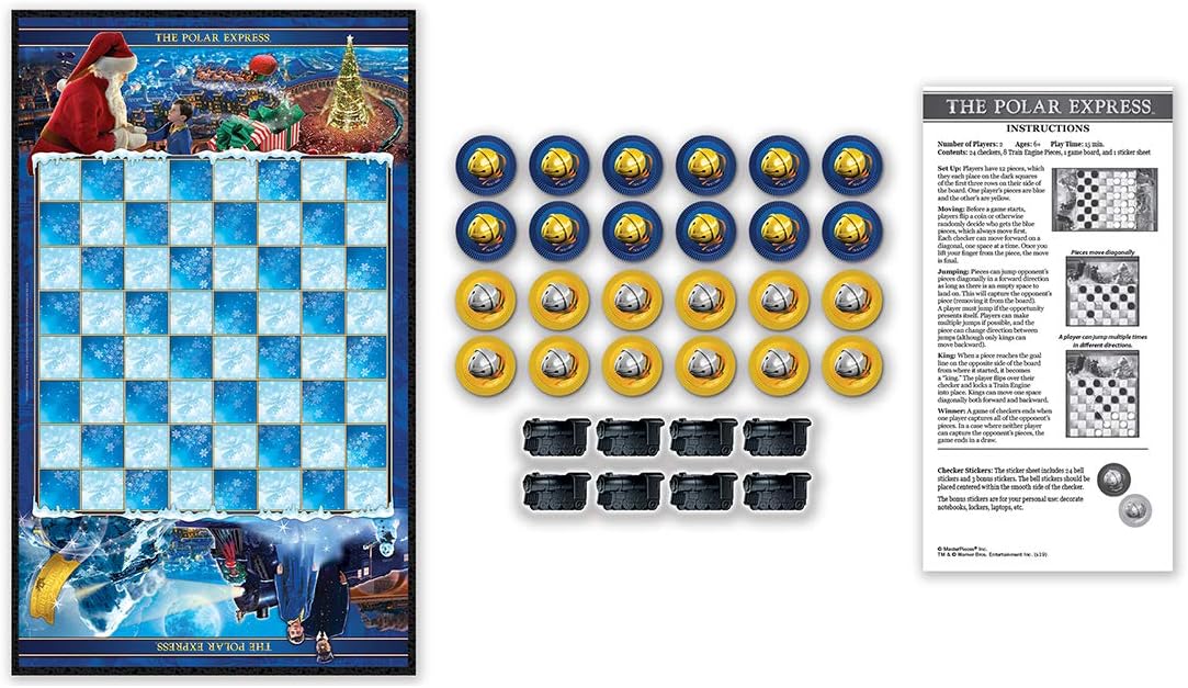This MasterPieces officially licensed Polar Express™ Checkers Game is the classic game of checkers where the king wears a train engine! The game includes 24 blue and gold The Polar Express™ checkers pieces, 8 train engine king pieces, a 13" x 21.375" wintry North Pole game board, 1 sticker sheet, and instructions. For 2 players, children and adults ages 6+.