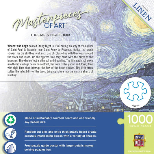 This MasterPieces 19.25" x 26.75" 1000pc Van Gogh's classic Starry Night in brilliant colorful detail. This puzzle is made of linen material which makes it easier to grip and see with no-glare. This linen puzzle is the perfect gift for any puzzle lover! To reduce their impact on our environment, the chipboard used in these puzzles is made of 100% recycled material.