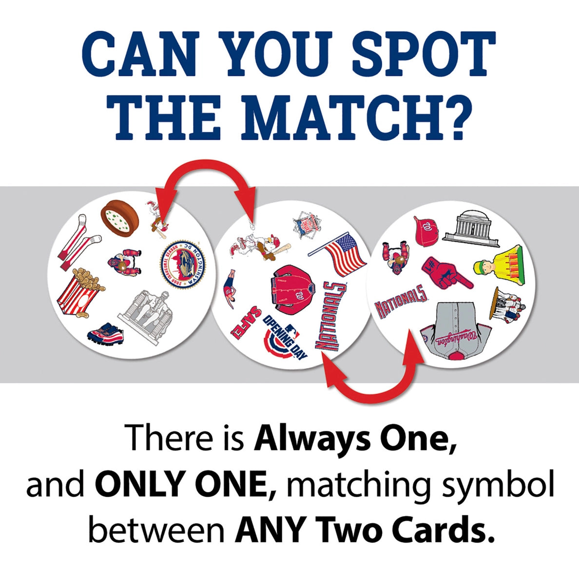 Spot It! Officially licensed MLB Washington Nationals Edition puts an exciting spin on the family favorite. Just like the other Spot It! games, this Washington Nationals Edition comes with a variety of unique symbols for you to identify and match from card to card. Many of the symbols represent the Washington Nationals and the league. Play it once or play all night, with 55 unique cards and five different mini-games, you'll catch yourself going into extra innings with Spot It! Washington Nationals Edition. Games take approximately 5 to 10 min to complete and is perfect for children and adults ages 7 and up.