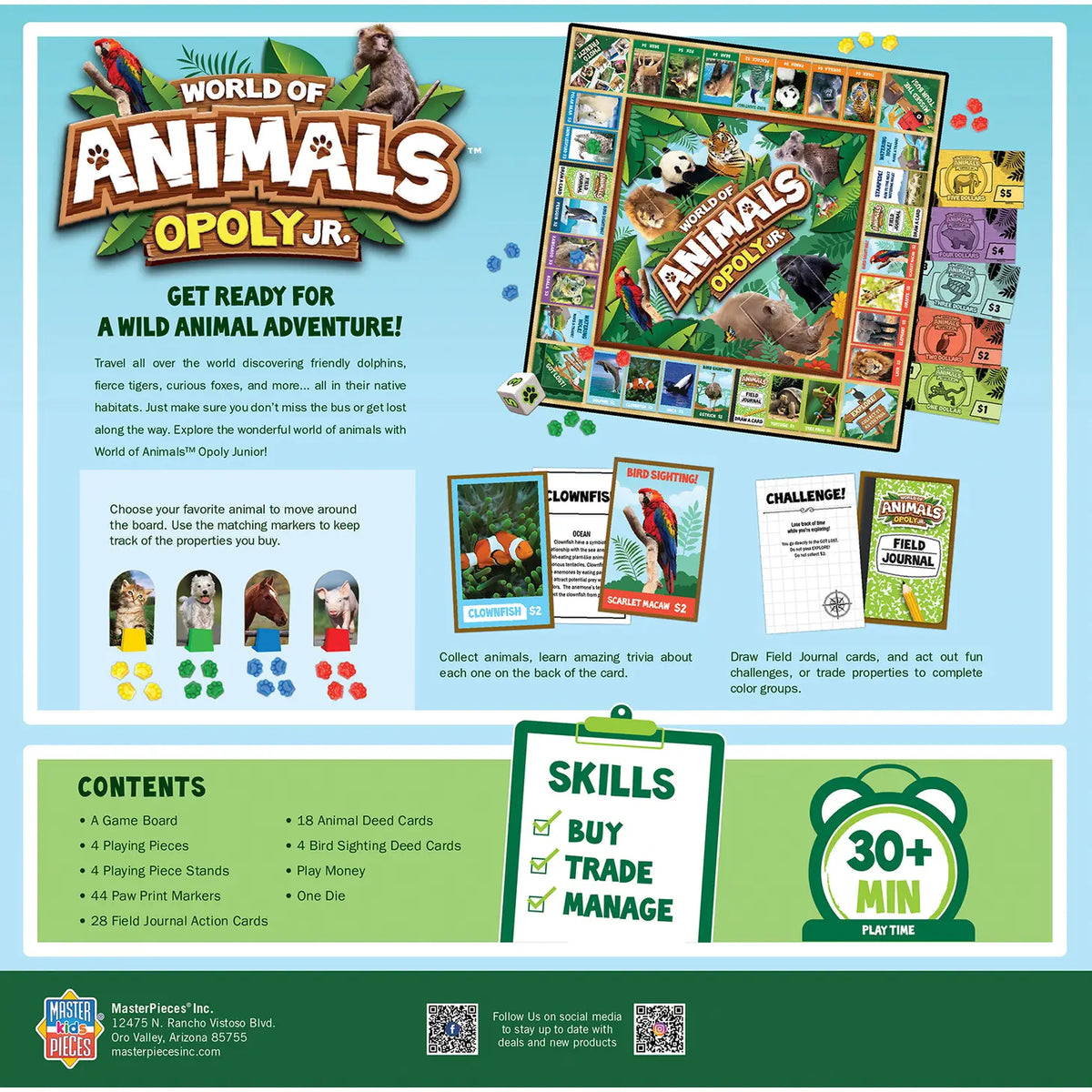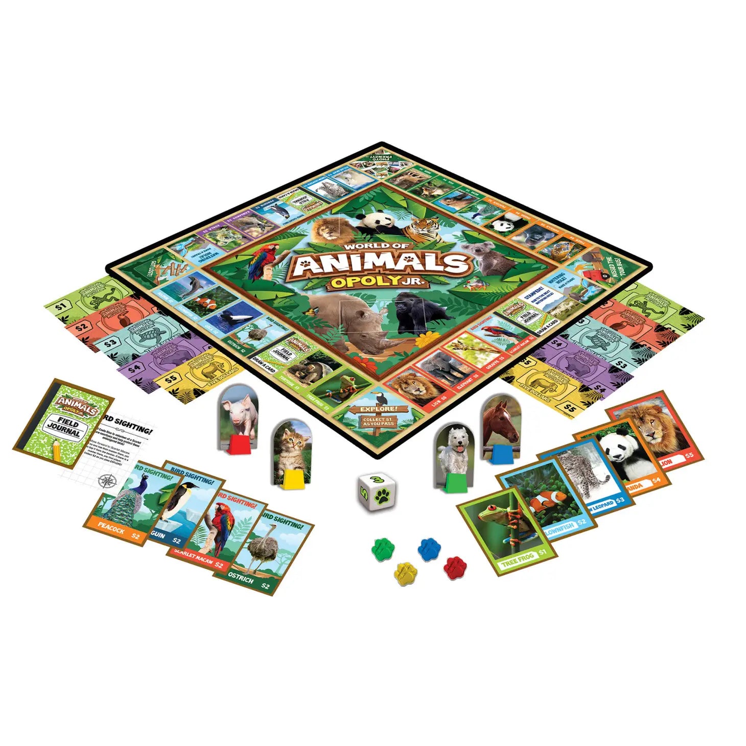 This officially licensed World of Animals Board game is a great way for families, kids, and adults to spend time together and have some fun. The World of Animals Explore Opoly Junior is perfect for animal-loving families. Players can travel all over the world discovering friendly dolphins, fierce tigers, curious foxes, and more... all in their native habitats. As they collect animals, players can learn amazing facts about each one on the back of the card. The game is sure to provide hours of entertainment for all. The World of Animals Explore Opoly Junior comes complete with a game board, 4 punch-out playing pieces with plastic stands, 44 paw print plastic markers, 28 field journal cards, 18 animal deed cards, 4 bird sighting deed cards, custom money, custom paw print die, and rules.