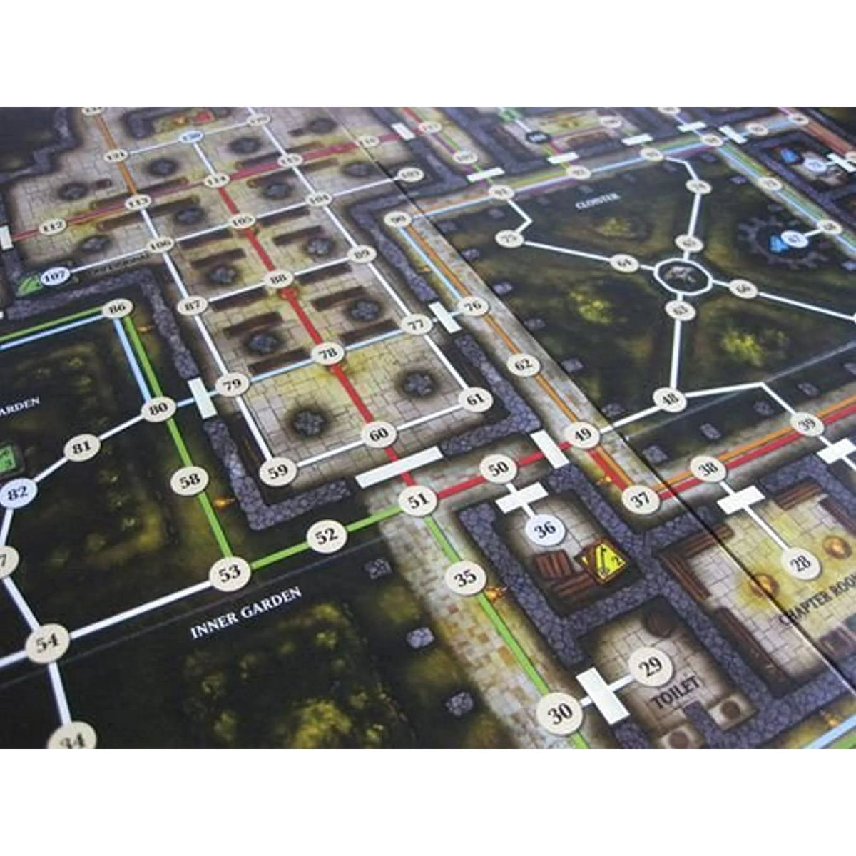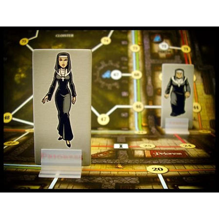 “…To be sure, your sin will find you out. ” —numbers 32: 23 The novices are on the loose. Temptation has lured them out of their cells, and they hope not to be caught by the abbess and the prioress. But the guards are swift and their hearing is excellent, so it will take craftiness and a bit of luck in order to make it back to their beds without being caught. In nuns on the run You explore the exciting nocturnal world of a grand abbey filled with intrigue and deception. As the old abbess, the noble prioress, or a simple novice you become hunter or prey. Everyone gets a special “blessing,” but only the novices try to fulfil a “secret wish. ” they must sneak through the dimly lit halls, corridors, and gardens, seeking keys and treasures unique to their goal. Meanwhile, the vigilant abbess and prioress patrol their routes, ever watchful of young novices who should be fast asleep in their austere cells. Are you wily enough, or sneaky enough to fulfil your quest and win the night. Nuns on the run is a very casual, social game for 2-8 players ages 10 and older. You can play a game in about 45-60 minutes. Nuns on the run contains: 1 game board, 1 pad of movement log score sheets, 2 stand-up player figures, 12 noise/vanished tokens, 6 novice tokens, 66 cards, 1 six-sided die, 1 turn marker, 1 captured marker, 1 straight-edge, and a rulebook.
