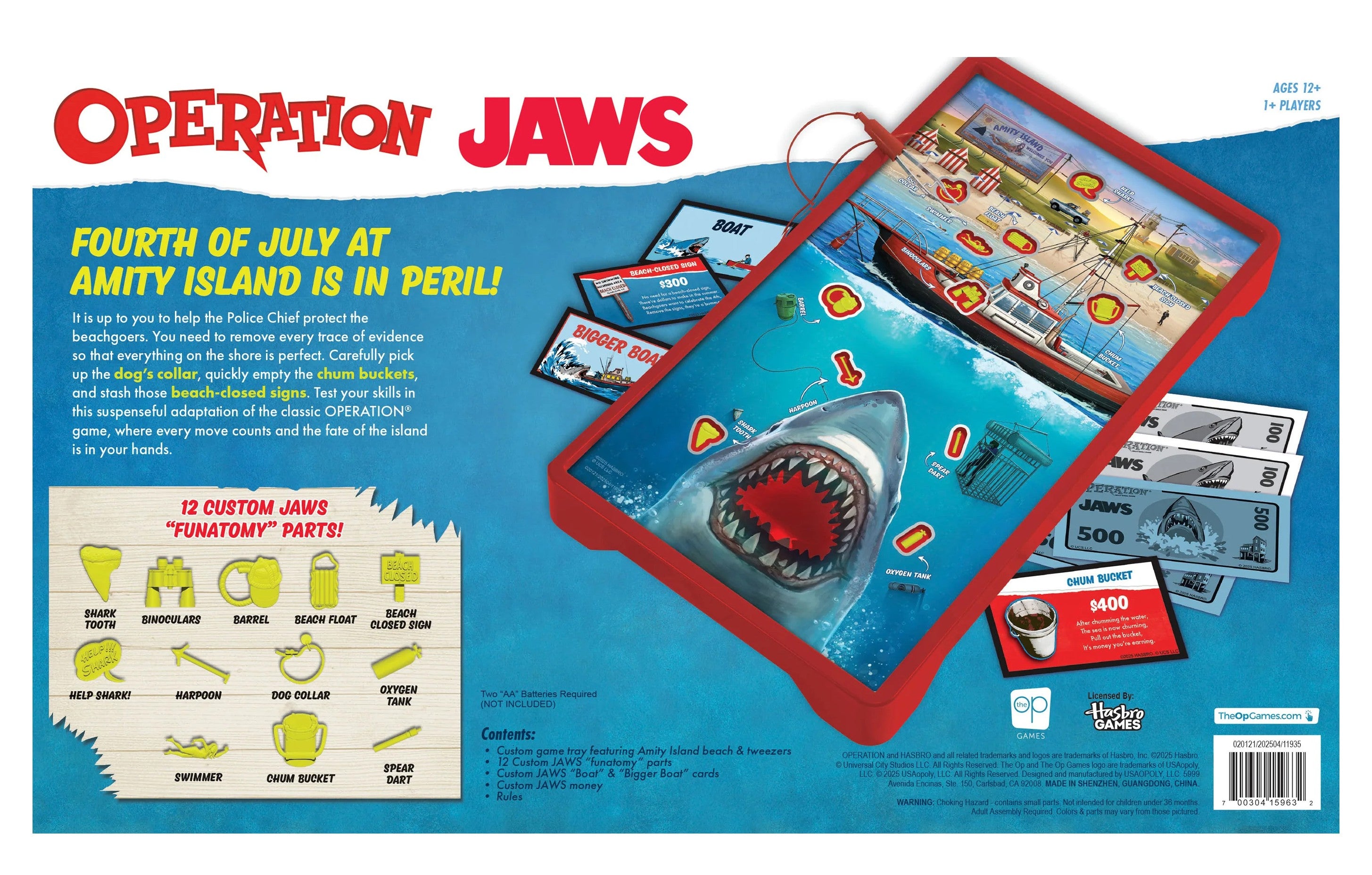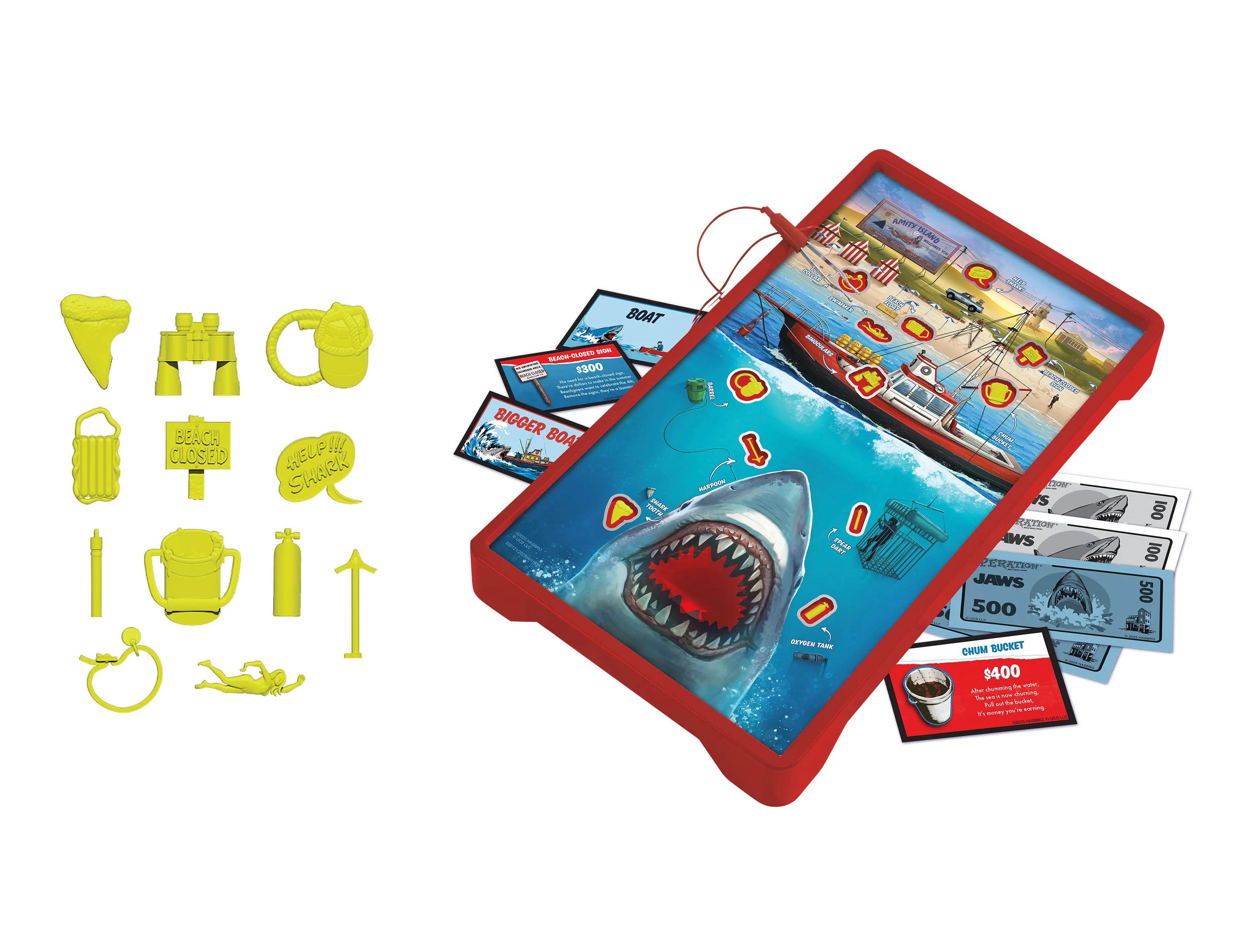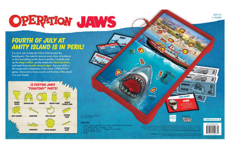 Prepare yourself for the most suspenseful adaptation of the classic OPERATION® game, with JAWS®. Every move counts and it is up to you to help the Police Chief protect the beachgoers at Amity Island. You need to remove every trace of evidence that not everything on the shore is perfect — pick up the dog’s collar, empty the chum buckets, and stash those beach-closed signs. On your turn, draw a Boat card to see what needs to be removed. However, if you make a mistake, the shark’s mouth will light up. Then, it is time for the player with the Bigger Boat card to try the same operation. The richest player, when the last operation is a success, wins!
