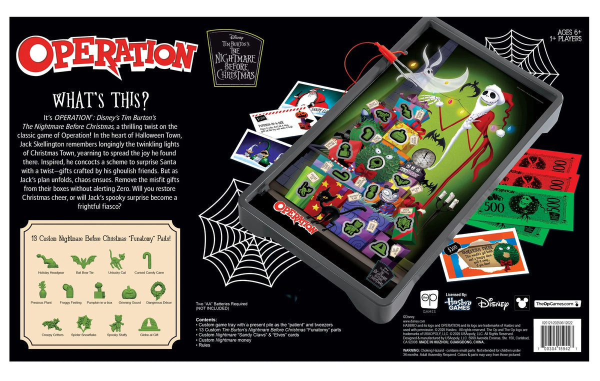 Step into the eerie yet enchanting world of Halloween Town with OPERATION®: Disney Tim Burton's The Nightmare Before Christmas, a thrilling twist on the classic game! In this version, Jack Skellington longs for the sparkle and warmth of Christmas Town and dreams of adding his unique touch to the holiday.