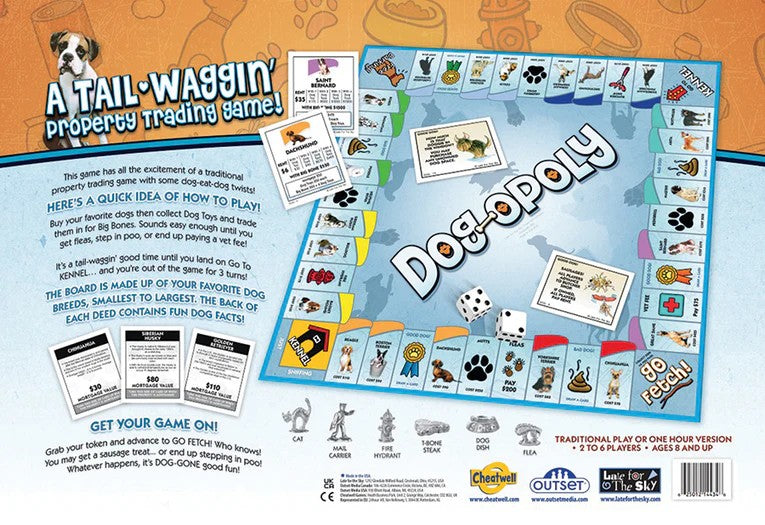 Get your paws on the newest "Dog-Opoly"! Collect cool pup stuff like squeaky toys and chew bones, then trade them in for even bigger bones. Go Fetch! And may the best pup win!