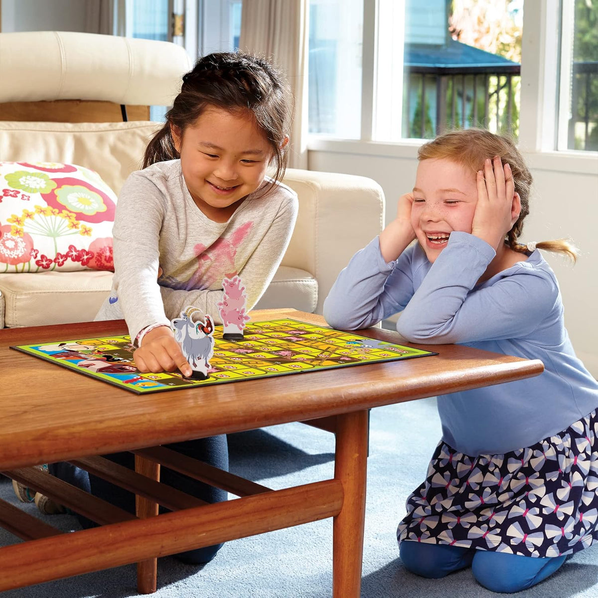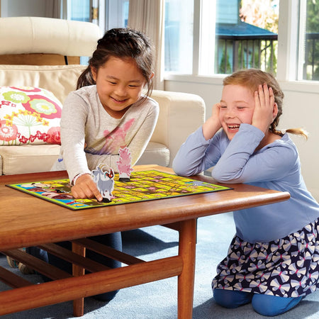 FARM: SNAKES AND LADDERS - Are you ready to moo-oooove!?! Farm Snakes and Ladders is loads of muddy fun for young farmers. Players use their counting skills as they climb haystack ladders and slide down muddy piggy slides. It's a hectic race to climb the ladders and be the first player to reach the barn. The farm animals are having so much fun counting their way to the win - will it be you? So, select your playing piece, and flick the spinner. Game includes six stands, seven fun animal playing pieces, large game board, and spinner. Builds basic counting and direction/movement comprehension skills. Classic play pattern for 2-6 players Ages 3+.