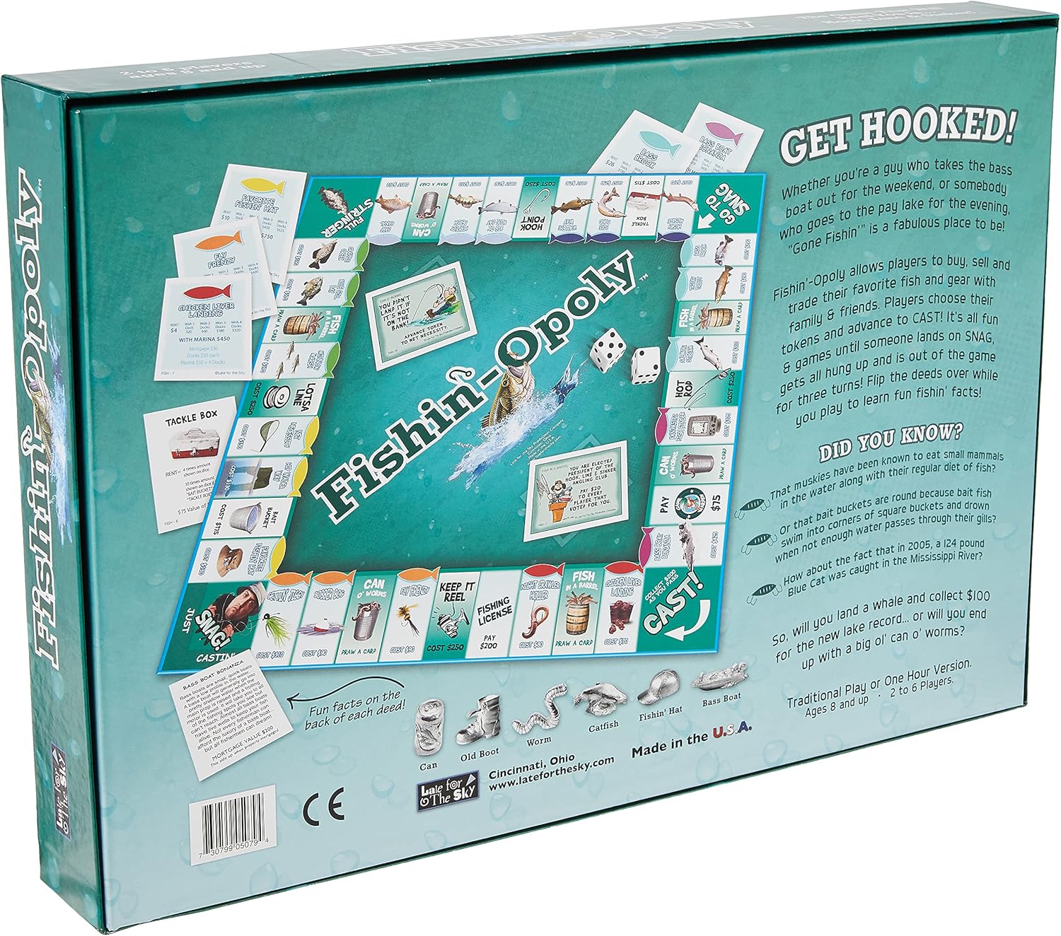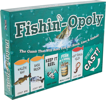 The Fishin'-Opoly is a game that will reel you in, hook, line and sinker. Whether you're a guy who takes the bass boat out for the weekend, or somebody who goes to the pay lake for the evening, Gone Fishin' is a fabulous place to be. The game allows players to buy, sell and trade their favorite fish and gear with family and friends. Players choose their tokens and advance to cast. It's all fun and games until someone lands on snag, gets all hung up, and is out of the game for three turns.