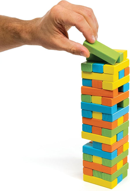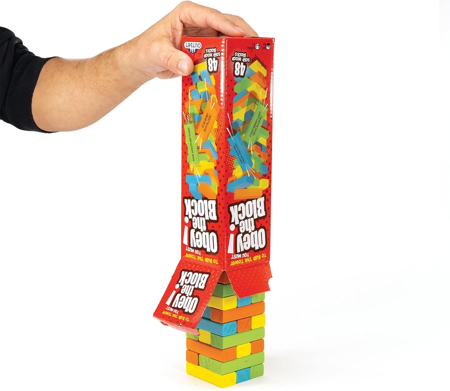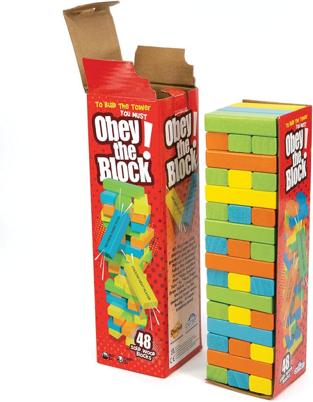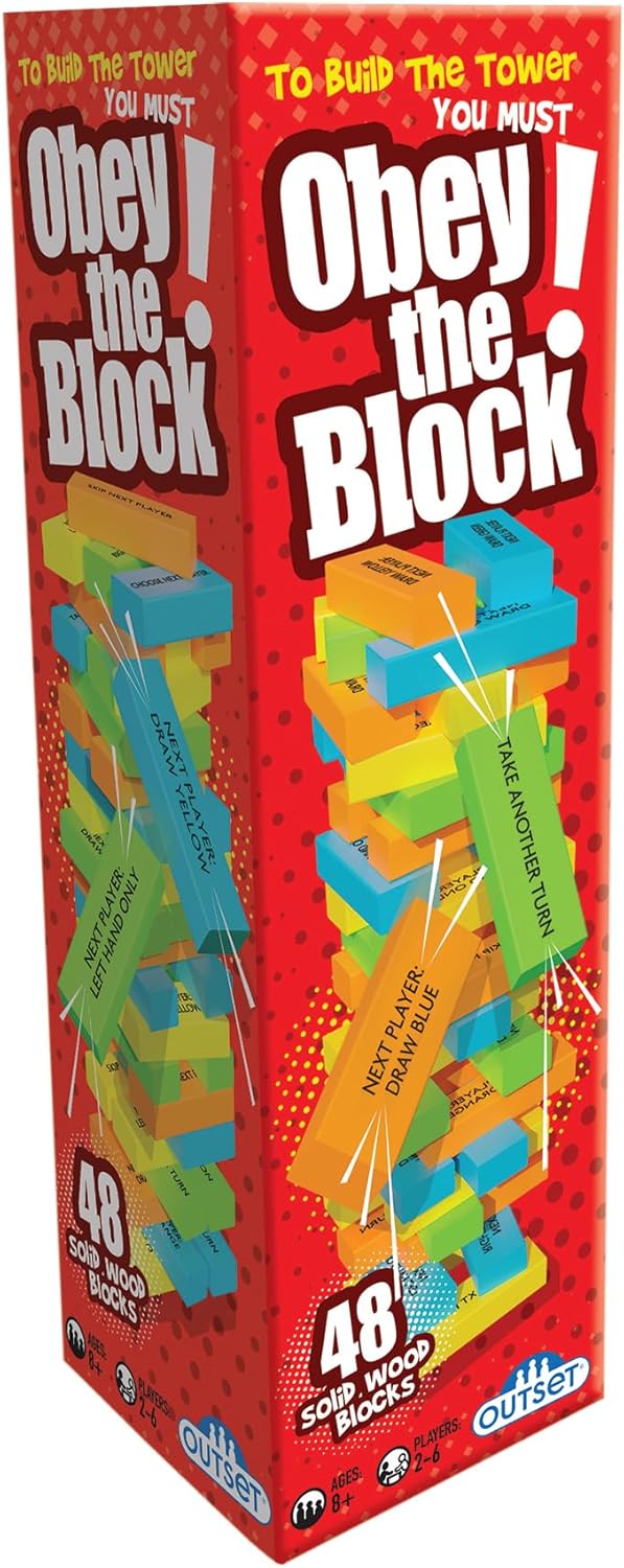 To build the tower you must "Obey the Block"! Draw a blue block! Use your left hand! Take another turn! The classic game of physics, luck and a steady hand, with a playful twist. Now you must do what the block says when you remove it from the tower. Includes 48 wooden blocks.