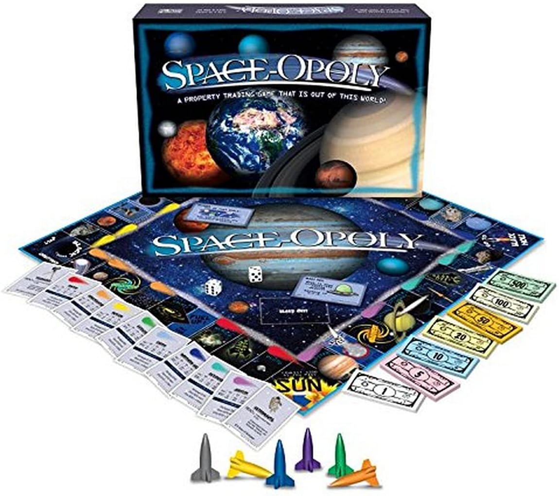 Take on intergalactic adventures with "Space-Opoly"! This intense property trading board game is the perfect way to explore unknown galaxies with friends! Take risks and make decisions about the great unknown. Collect your favorite cosmic wonders and play to rule the universe. Get lost in "Space-Opoly"--blast off and play! Just watch out for the black hole or you won't be home in time for dinner!