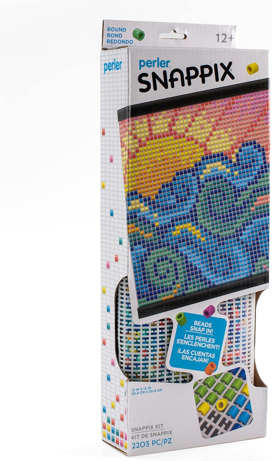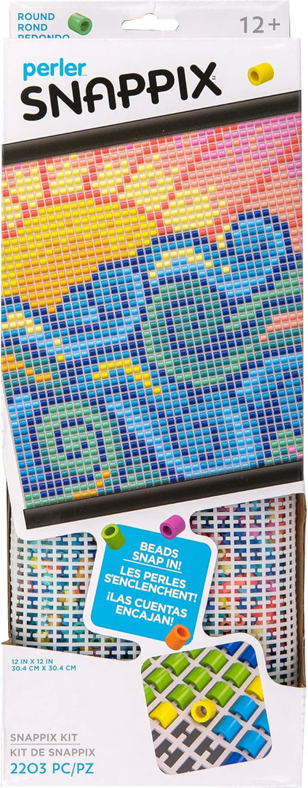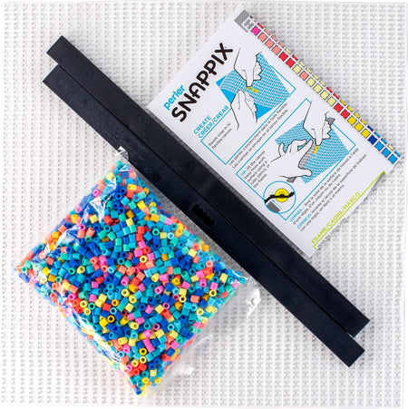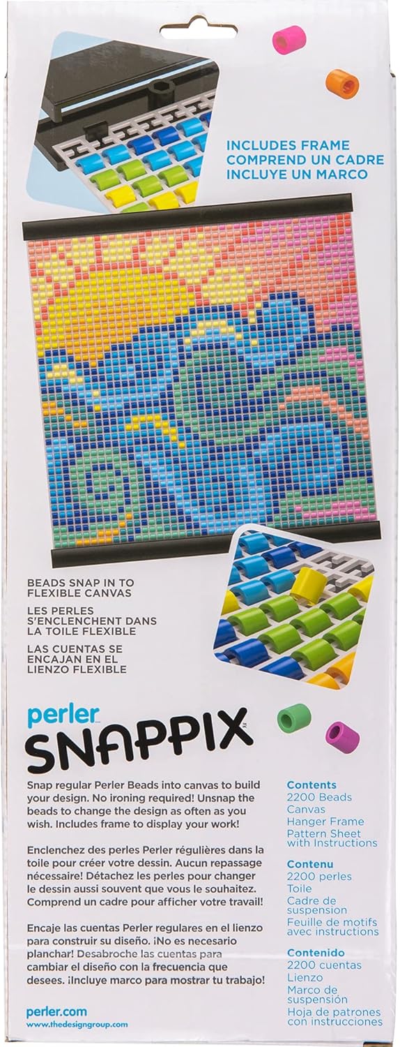- Perler Snappix no iron bead kit includes (2,200) round beads, (1) black mesh canvas, (1) hanger frame, and (1) pattern sheet with instructions