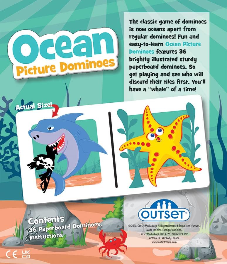 Picture Dominoes: Ocean is a classic matching game for the young ones. Each game contains 36 brightly illustrated sturdy paperboard dominoes. Be sure to look for other themes like Dino and Farm. Case Pack 12 Width 5.5" Origin China Height 6.5"Depth 2" Item # 19208 Weight 0.71 lbs.