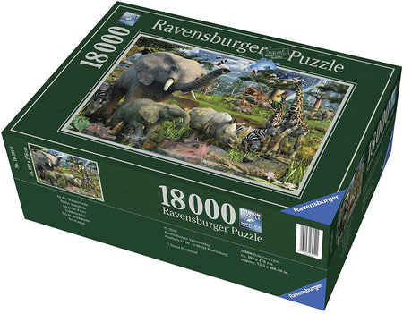 Challenge yourself with this 18000-piece puzzle, featuring exotic animals, such as elephants, giraffes, zebras, crocodiles, and lions gathering at a waterhole.