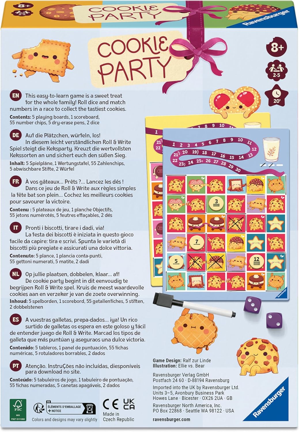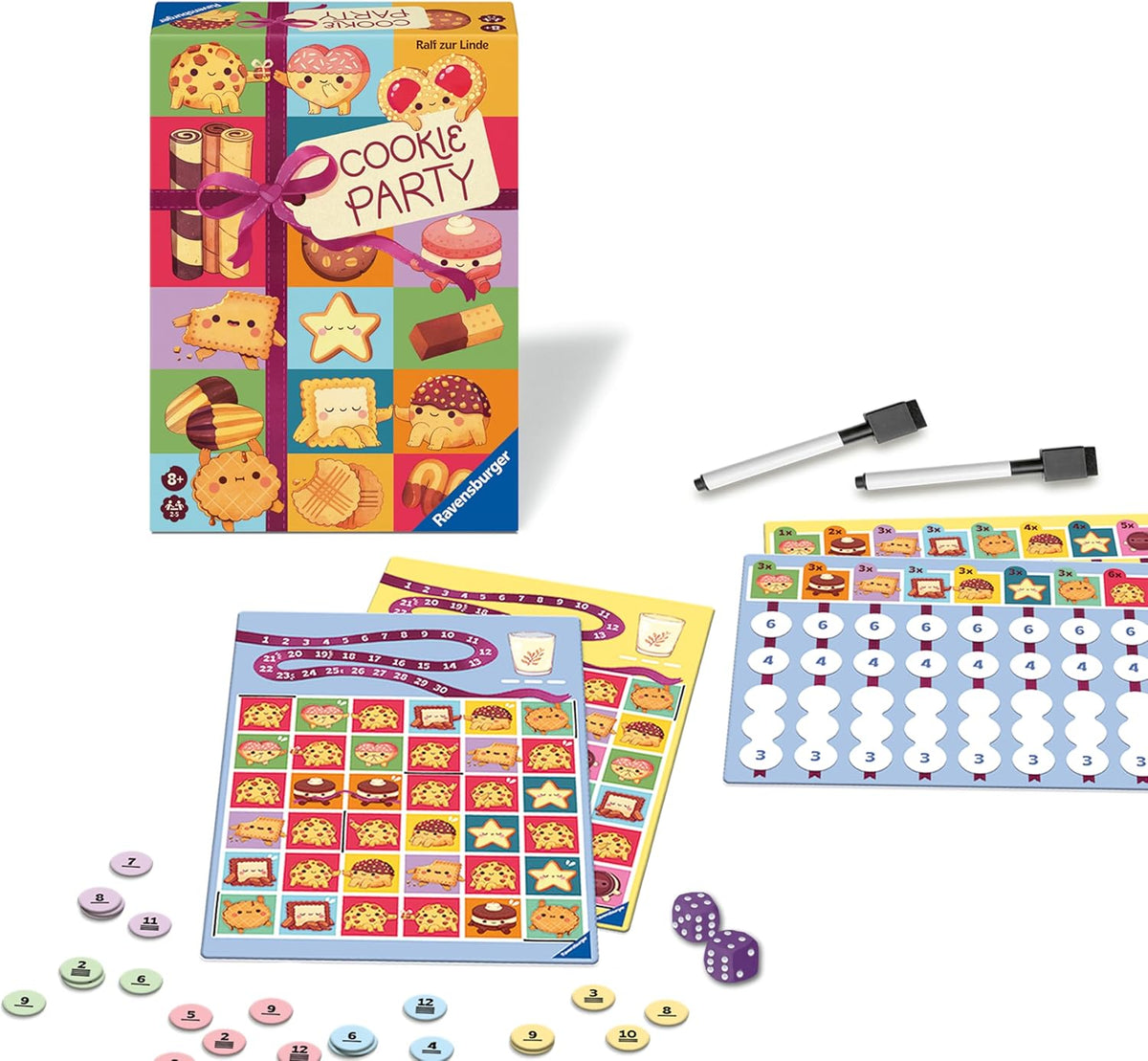 In this exciting game for ages 8 and up, dice luck and cleverness are required to draw walls on your own game board as quickly as possible and tick off the most valuable types of cookies. In the "Cookie Party" game, everyone plays simultaneously: The dice and number chips determine where walls may be drawn on the game board. If a cookie is completely enclosed in the process, it can be ticked off.