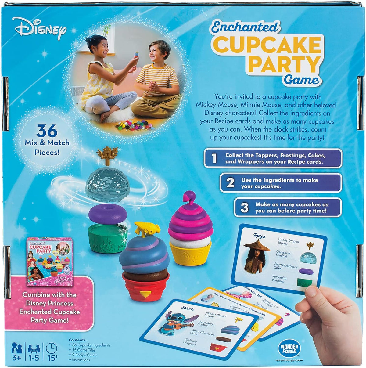 - What You Get – Disney Enchanted Cupcake Party Game comes with 36 Cupcake ingredients, 15 Game tiles, 9 Recipe cards, and a rulebook.