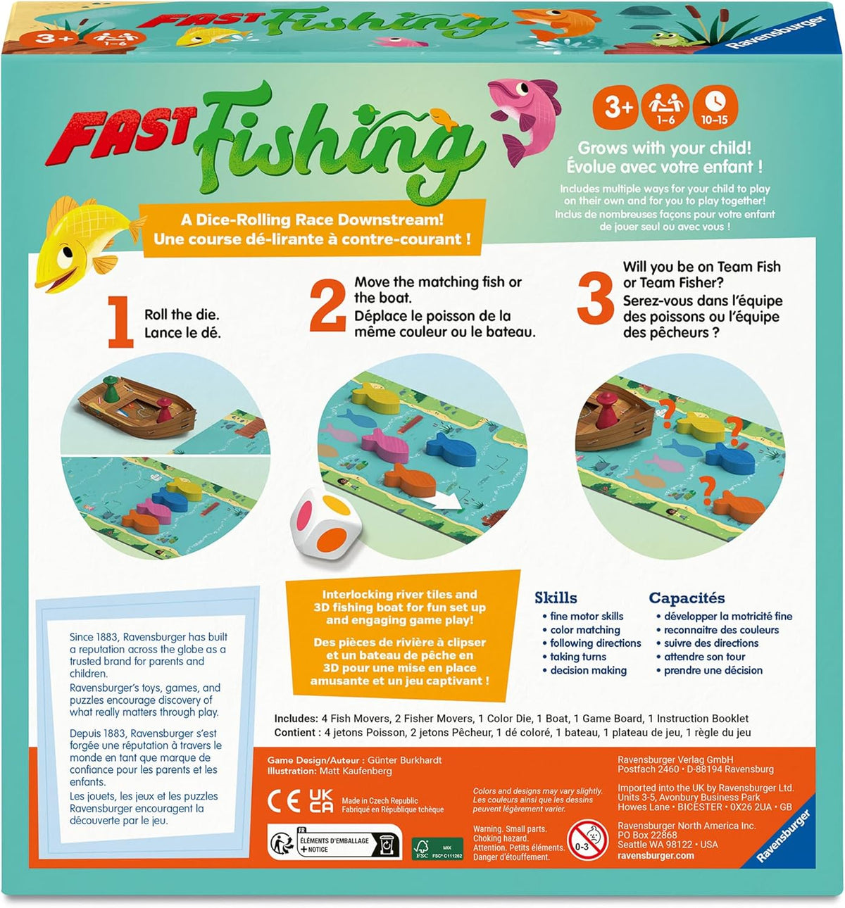 - QUALITY CONTENTS: 1 game board in 3 parts with several difficulty levels, 1 large boat to assemble, 1 colored dice, 4 fish and 2 wooden fishermen, 1 set of rules. For 2 to 6 players aged 3 and over for games lasting around ten minutes.