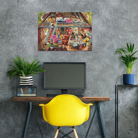 Neither too hard nor too easy, this Dean MacAdam puzzle is “just right” with a peek into the Three Bears’ home and how “Goldilocks Gets Caught!” Someone’s been eating Papa Bear’s porridge, and someone’s been sitting in Mama Bear’s chair, and someone’s been sleeping in Baby Bear’s bed, and she’s still there! The Three Bears just left for a quick walk while this impertinent young girl waltzed in and helped herself to whatever she liked. Maybe having a huge fright and jumping out the window will teach her not to trespass! Leave it to Dean MacAdam to set the scene for many hours of perfectly relaxing puzzle fun! Did you know in the original story the three bears were not a family but just friends? Eleanor Mure wrote the first recorded version of The Three Bears nursery tale in 1831; a handmade, illustrated book for her nephew. In her story, the troublemaker isn’t a young girl, but a meddling old woman. Later versions introduced a young girl named “Silver-Hair” who, by 1904, became Goldilocks. This 1,000-piece jigsaw puzzle combines captivating imagery with clean-cut pieces and Ravensburger’s perfect interlocking fit for a most pleasurable puzzling experience!