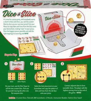 Welcome to Dice and Slice the hottest, most scrumptiously strategic dice game to ever come fresh from the oven. In Dice and Slice, it's a flavorful frenzy as players roll to dice and slice the largest pieces on their scoresheet. No other game lets you pit your mind and wit against friends, family, or pizza-loving strangers.