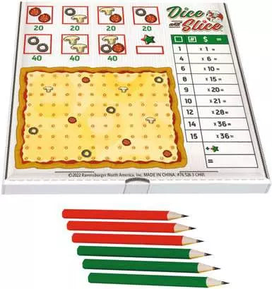 Strategically take the dice you want and assign the other to players and bonus points scored for toppings included in slices. Dice your scoreboard up to the largest slices to win the most points, Perfect for family game night, a pizza party with friends, and all dice game lovers. You'll knead this game on your shelf faster than it takes to order extra cheese. Get ready to serve up some sizzling strategies because victory is a dish best served hot! Disclaimer: Any scoresheets cannot be consumed no matter how big and delicious they look. If you try to eat anything, we suggest you order a real pizza!