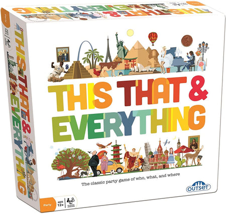 This That & Everything is a fast-paced, easy to learn, crowd pleasing party game. In this rapid-fire game, players race to describe a wide variety of famous people, things, and places for their teammates to guess - in less than 30 seconds! If you hear the description, "Princess and movie star" - shout out, "Grace Kelly"! Or, if it's a description from the Thing category like, "Footwear for rainy days" - shout out, "Rubber boots"! And if you hear descriptions like, "NYC...Gotham...the city that never sleeps", hurry up and shout out, "The Big Apple" because you don't want to run out of time! A random list of six items makes winning a challenge - so be ready to shout out this, that, and everything in between to earn the most points...and do it all under 30 seconds!