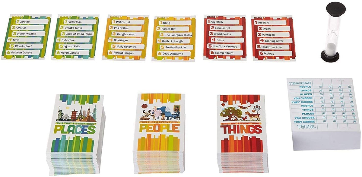- CONTENTS: 396 cards (132 People Cards, 132 Things Cards, 132 Places Cards), score pad, 30-second sand timer, instructions