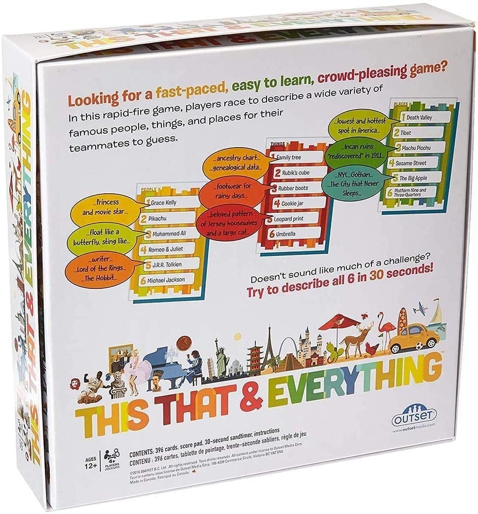 This That & Everything is a fast-paced, easy to learn, crowd pleasing party game. In this rapid-fire game, players race to describe a wide variety of famous people, things, and places for their teammates to guess - in less than 30 seconds! If you hear the description, "Princess and movie star" - shout out, "Grace Kelly"! Or, if it's a description from the Thing category like, "Footwear for rainy days" - shout out, "Rubber boots"! And if you hear descriptions like, "NYC...Gotham...the city that never sleeps", hurry up and shout out, "The Big Apple" because you don't want to run out of time! A random list of six items makes winning a challenge - so be ready to shout out this, that, and everything in between to earn the most points...and do it all under 30 seconds! Contains 396 cards (132 People Cards, 132 Things Cards, 132 Places Cards), score pad, 30-second sand timer, instructions. Ages 12 and up, 4+ players.