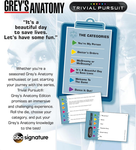 - It’s a beautiful day to save lives. Let’s have some fun! Test Your Grey's Anatomy Knowledge with 600 questions across categories like You’re My Person, Doctor’s Orders, and more with Trivial Pursuit: Grey’s Anatomy Edition.