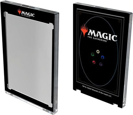 The ONE-TOUCH Edge combines the premium protection you expect from every ONE-TOUCH card holder with a full-color, Magic: The Gathering printed art border for added style! Designed as the final destination for your collectible trading cards, two-piece ONE-TOUCH holders are uniquely designed with slide-in hinges and magnetic closure so you'll never have to use a screwdriver again. This ONE-TOUCH Edge features the modern Magic: The Gathering card back design, perfect for showcasing all of the latest and greatest cards in your collection. The holder uses UV-blocking additives to protect your card from harmful UV rays and is made with non-PVC materials to provide acid-free protection - ensuring your valuable hit retains its condition while under the display. This model can hold standard size Magic: The Gathering cards (2 5/8 in. x 3 ¾ in.) up to 35pt in thickness. (Card not included)