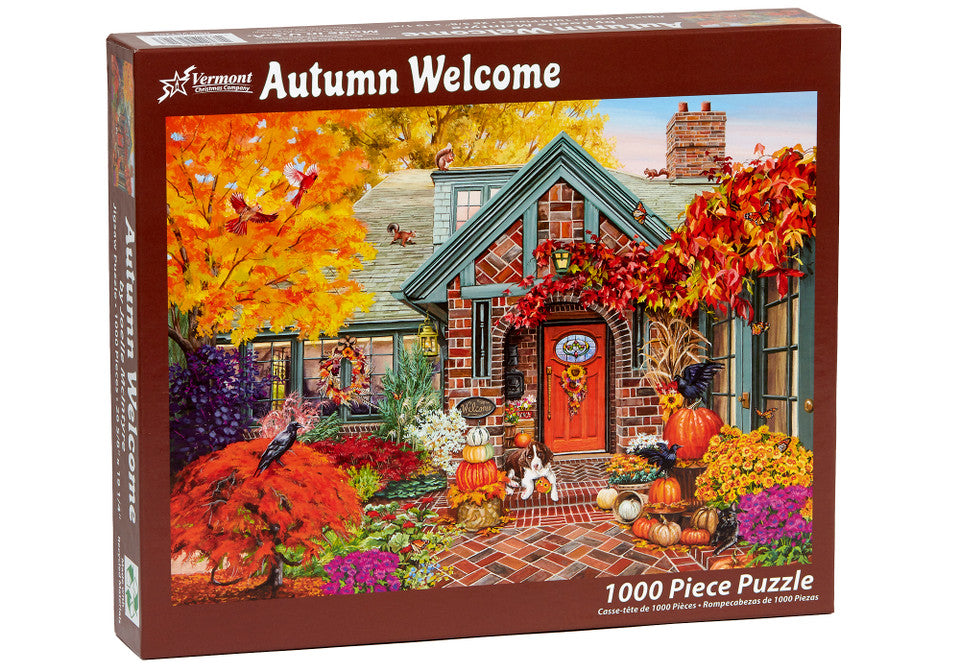 Get ready to fall in love with the "Autumn Welcome" jigsaw puzzle by Vermont Christmas Company. This delightful 1000-piece puzzle features a cozy, autumnal scene complete with furry visitors!