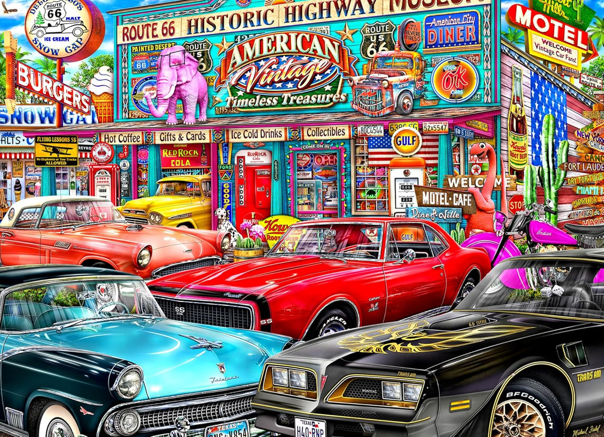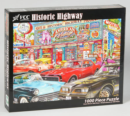 Step back in time with the "Historic Highway" puzzle by Vermont Christmas Company! This 1000-piece jigsaw puzzle, designed by Michael Fishel, captures the essence of Americana and will transport you to a nostalgic and retro era of American automobiles! Get ready to piece together this masterpiece, featuring Americana treasures!