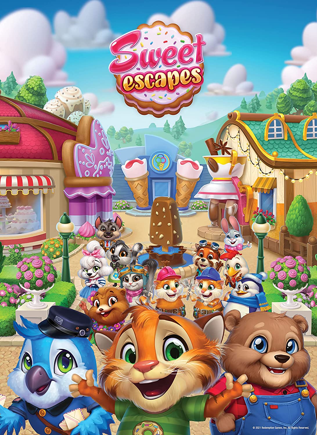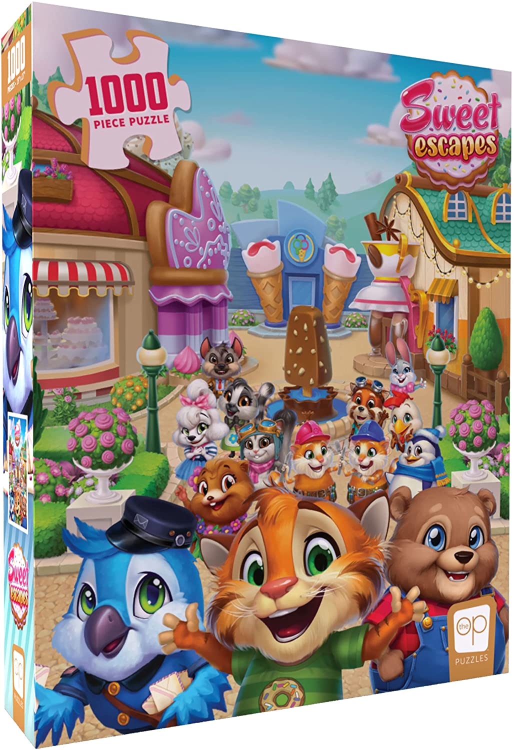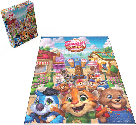 Helpful friends are excited for you to build your bake shop in this 1,000-piece “Welcome To” Sweet Escapes jigsaw puzzle, featuring Duncan, Scoops, Cherry, Wings, and others in a sweet portrait from Redemption Games’ adorable mobile matching game.