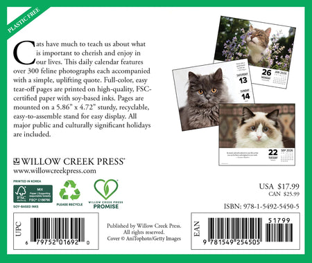 FELINE PHILOSOPHIES – Let these delightful cats teach you the essentials of a fulfilling life through colorful images and insightful text. Learn lessons on grooming, nutrition, and independence inspired by our feline companions. Full-color images on easy tear-off pages are printed on high quality, FSC certified paper with soy-based inks. Pages are mounted on a recyclable stand for easy display. All major public and culturally significant holidays are included.