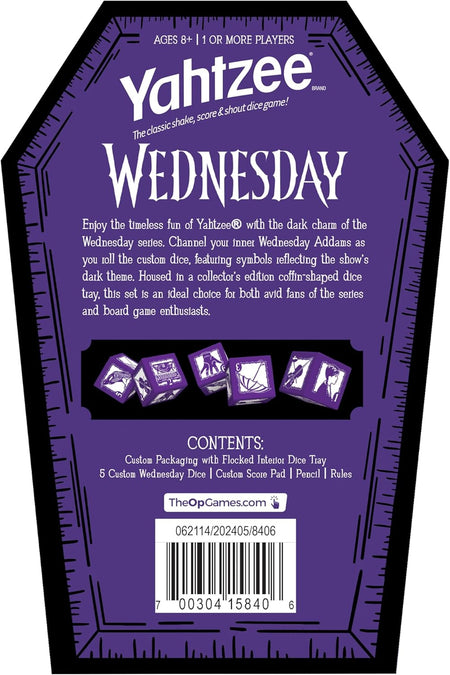 Enjoy the timeless fun of Yahtzee with the dark charm of the Wednesday series. Channel your inner Wednesday Addams as you roll the custom dice, featuring symbols reflecting the show's dark theme. Housed in a collector's edition coffin-shaped dice cup, this set is an ideal choice for both avid fans of the series and board game enthusiasts.